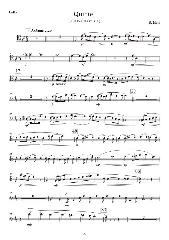 スコア譜とパート譜(フルート、クラリネット、オーボエ、チェロ)がセットになっています。